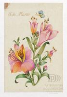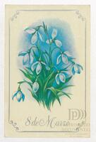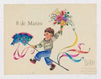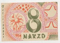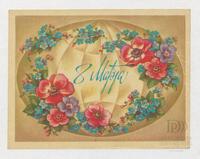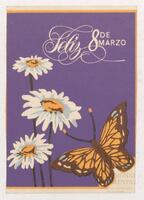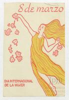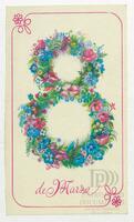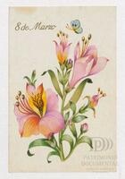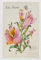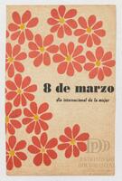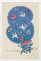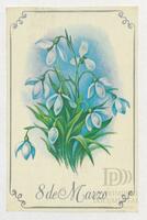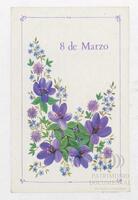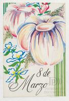 Tarjeta Postal de felicitación por el Día internacional de la mujer con dibujo de flores. En el anverso de la postal aparecen las palabras 8 de marzo en español y en el reverso se muestra un mensaje manuscrito en inglés para Miriam Villar.