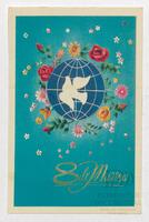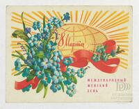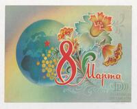 Tarjeta Postal de felicitación por el día internacional de la mujer con ilustración de unas flores y el globo terráqueo. En el anverso de la postal se muestran las palabras en ruso 8 de marzo y en el reverso aparece un mensaje manuscrito en español para María Luisa.