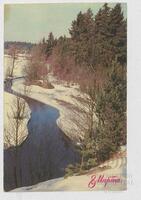 Tarjeta Postal de felicitación por el Día internacional de la mujer con vista de un bosque nevado. En el anverso de la postal aparecen las palabras 8 de marzo en ruso y en el reverso se muestra un mensaje manuscrito en español de Viti.