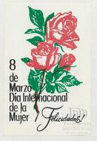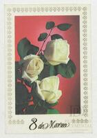 Tarjeta Postal de felicitación por el Día internacional de la mujer con imagen de flores. En el anverso de la postal se aprecian las palabras en ruso Día Internacional de la Mujer 8 de marzo y en el reverso aparece un mensaje manuscrito en español.