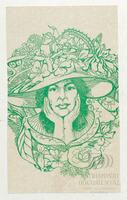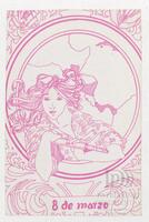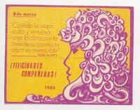 Tarjeta de felicitación por el Día internacional de la mujer con ilustración de una mujer. En el reverso de la tarjeta aparece un mensaje manuscrito de felicitación en español del compañero Alejandro Díaz R.