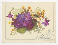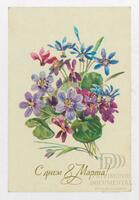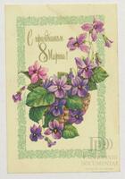 Tarjeta de felicitación por el Día internacional de la mujer con imagen de unas flores moradas. En el anverso de la postal se aprecia las palabras en ruso Felices fiestas 8 de marzo y en el reverso aparece un mensaje manuscrito en español de Rafael Ramírez Díaz para Ana Sopeña Derocelet.