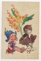 Tarjeta Postal de felicitación por el Día internacional de la mujer con dibujo de una niña con un escarabajo, un pájaro y unas flores. En el anverso de la postal se aprecian las palabras en ruso 8 de marzo y al dorso aparece un mensaje en ruso y un dibujo hecho a mano.