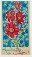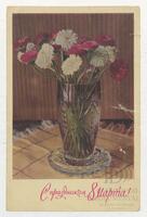 Tarjeta Postal de felicitación por el Día internacional de la mujer con imagen de flores. En el anverso de la postal se observan las palabras en ruso Feliz día 8 de marzo y en el reverso aparece un mensaje manuscrito en español de José Duari para Eloina.