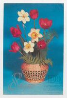 Tarjeta Postal de felicitación por el Día internacional de la mujer con imagen de unas flores rojas y amarillas en una cesta. En el anverso de la postal se aprecian las palabras en ruso 8 de marzo y en el reverso aparece un mensaje mecanografiado en español de A. Skvortsov para su compañera.