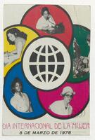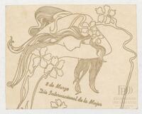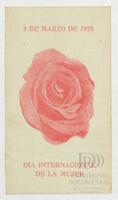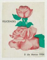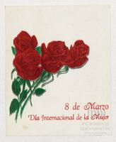 Tarjeta Postal de felicitación por el Día internacional de la mujer con dibujo de flores. En el reverso aparece un mensaje manuscrito de felicitación en español para Aleida Gutiérrez.