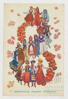 Tarjeta Postal de felicitación por el Día internacional de la mujer con ilstración de varias mujeres con sus trajes típicos nacionales. En el anverso de la postal se aprecian las palabras en ruso Felicidades, queridas mujeres y en el reverso aparece un mensaje manuscrito en ruso y un sello gomígafo.