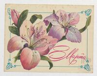 Tarjeta Postal de felicitación por el Día internacional de la mujer con imagen de flores blancas y moradas en un búcaro. En el anverso de la postal se aprecian las palabras en ruso Felices fiestas 8 de marzo y en el reverso aparece un mensaje manuscrito de felicitación en español de Nicolai y Alejandro.