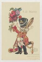 Tarjeta Postal de felicitación por el Día internacional de la mujer con ilustración de un conejo con unas flores. En el anverso de la postal aparecen las palabras 8 de marzo y en el reverso se muestra un mensaje manuscrito en español de Mary.