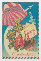 Tarjeta Postal de felicitación por el Día internacional de la mujer con ilustración de flores en cayendo desde un avión en un paracaídas. En el anverso de la postal aparecen las palabras en ruso Felices fiestas 8 de marzo y en el reverso aparece un mensaje manuscrito en español para Anita de sus compañeros.