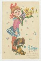 Tarjeta de Postal de felicitación por el Día internacional de la mujer con dibujo de una niña con unas flores y acompañada de un perro. En el anverso de la postal aparecen las palabras en ruso 8 de marzo y en el reverso se observa un mensaje manuscrito en español de Manuela Torres Viera para su nieta Claudia Aguilar.