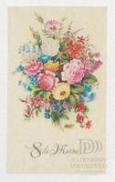 Tarjeta de felicitación por el Día internacional de la mujer con imagen de flores. Al dorso aparece un mensaje mecanografiado de felicitación y varias firmas.