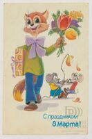 Tarjeta Postal de felicitación por el Día internacional de la mujer con ilustración de unos dibujos animados. En el anverso de la postal se muestran las palabras Felices fiestas 8 de marzo en idioma ruso y al dorso aparece un mensaje manuscrito en español de Alejandro Águila para su nieta Claudia.