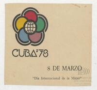 Tarjeta de felicitación por el Día internacional de la mujer con imagen del símbolo del XI Festival de la Juventud y los Estudiantes. En el reverso de la tarjeta aparece un mensaje de felicitación en español mecanografiado para la compañera Watty.