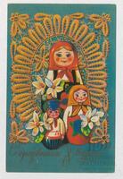 Tarjeta Postal de felicitación por el Día internacional de la mujer con dibujo de unas matrioskas. En el anverso de la postal se aprecian las palabras en ruso Felices fiestas 8 de marzo y en el reverso se muestra un mensaje manuscrito en español de Taty para Miriam, Mirita y Wydma.