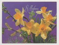 Tarjeta Postal de felicitación por el Día internacional de la mujer con imagen de flores amarillas. En el reverso de la postal aparece un mensaje manuscrito en español de Daniel para Magina Barreda.