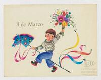 Tarjeta Postal de felicitación por el Día internacional de la mujer con imagen de un niño jugando con un ramo de flores en una mano y un juguete en la otra. En el reverso de la postal aparece un mensaje manuscrito en español de Santiaguito para Miriam, Mirita y Wydma.