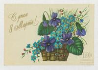 Tarjeta Postal de felicitación por el Día internacional de la mujer con dibujo de unas flores moradas y azules en una cesta. En el anverso de la postal se observan las palabras en ruso Feliz día 8 de marzo y en el reverso aparece un mensaje manuscrito de felicitación en español de Norah para Irma y familia.