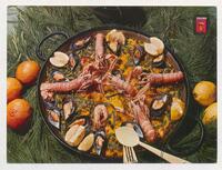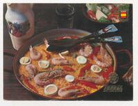 Tarjeta Postal con imagen de un Arroz con gambas a la casera. En el anverso de la postal se aprecia un escudo con los colores de la bandera española y el logo de Iberia y en el reverso se aprecia un mensaje manuscrito en español de Mary para Pedro Palencia y una breve descripción en español e inglés de cómo se realiza dicho plato típico de España.