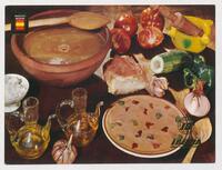 Tarjeta Postal con imagen de un Gazpacho andaluz. En el anverso de la postal se aprecia un escudo con los colores de la bandera española y el logo de Iberia y en la parte trasera se observa una breve descripción de cómo se realiza dicho plato típico de España.