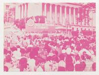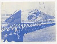 Tarjeta Postal con vista del Acto Inaugural durante el XI Festival Mundial de la Juventud y los Estudiantes en La Habana, Cuba, en 1978. En la parte trasera de la postal se muestra el logo del festival.