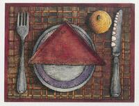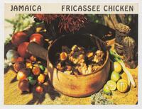 Tarjeta Postal con imagen de un Fricasé de pollo. En el reverso de la postal se aprecia una breve descripción en inglés de cómo se realiza dicho plato.