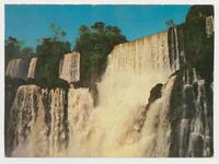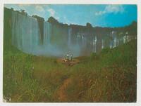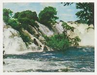 Tarjeta Postal con vista general de las Cataratas de Kalandula, anteriormente conocidas como las Cataratas del Duque de Braganza en Angola. En el reverso de la postal se observa un mensaje manuscrito en español de Niurka y Manuel para Alejandro y el logo de la editorial.