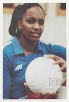 Tarjeta con imagen de la voleibolista cubana Josefina Capote con el balón. En el reverso de la postal aparecen logos y diseños representativos de los Juegos Panamericanos de 1991 en La Habana, Cuba.