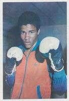 Tarjeta con imagen del boxeador cubano Ángel Espinosa con sus guantes. Al dorso de la postal aparecen logos y diseños representativos de los Juegos Panamericanos de 1991 en La Habana, Cuba.
