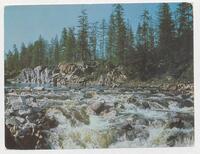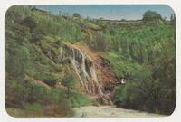 Tarjeta con perspectiva de las hermosas cascadas o garganta de Chegem en el complejo turista-recreativo de Kabardino-Balkaria en Rusia. En la parte trasera de la postal se observa una breve referencia del lugar en idioma ruso.