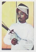 Tarjeta con imagen del esgrimista cubano Tulio Díaz con su florete. En la parte trasera de la postal aparecen logos y diseños representativos de los Juegos Panamericanos de 1991 en La Habana, Cuba.
