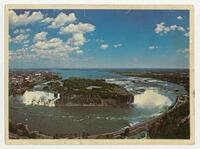 Tarjeta Postal con vista aérea general de las Cataratas del Niágara en Canadá. En el reverso de la postal se muestra un mensaje en italiano para Dayami Rodríguez y un sello postal de color azul con la imagen de Isabel II.