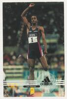 Tarjeta con imagen del atleta cubano Iván Pedroso haciendo un salto en una competencia. Al dorso de la postal aparecen su nombre, los logros profesionales que alcanzó y el logo de la marca Adidas.