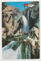 Tarjeta Postal con vista de la cascada en Fuentes del Algar en Callosa de Ensarría, España. En el reverso de la postal aparece un mensaje manuscrito en español y en el anverso se muestra el escudo de la ciudad y las palabras Recuerdo de Fuentes del Algar.