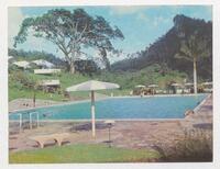 Tarjeta Postal con vista del Río, Balneario de San José Púrua en México. Al dorso de la postal se muestran el escudo del balneario y el logo de Mexichrome.