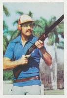 Tarjeta con imagen del cubano Guillermo Torres, deportista del Tiro, aguantando su escopeta. Al dorso de la postal se muestran logos y diseños representativos de los Juegos Panamericanos de 1991 en La Habana, Cuba.