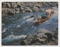 Tarjeta Postal con vista de una embaracación navegando por las aguas turbulentas del Río Hozu en Kyoto, Japón. En la parte trasera de la postal se muestra el logo de la editorial.