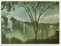 Tarjeta Postal con vista general de las Cataratas de Kalandula, anteriormente conocidas como las Cataratas del Duque de Braganza en Angola. En el reverso de la postal aparece un mensaje manuscrito en español de Ciro Castillo G. para su prima Esperanza y el logo de la editorial.