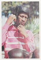 Tarjeta con imagen del boxeador cubano Candelario Duvergel asegurando el protector de cabeza. Al dorso de la postal aparecen logos y diseños representativos de los Juegos Panamericanos de 1991 en La Habana, Cuba.