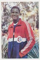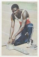 Tarjeta con imagen del atleta cubano Roberto Hernández en la pista. En la parte trasera de la postal aparecen logos y diseños representativos de los Juegos Panamericanos de 1991 en La Habana, Cuba.