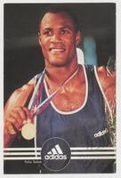 Tarjeta con imagen del boxeador cubano Félix Savón mostrando la medalla que cuelga de su cuello. Al dorso de la postal aparecen su nombre, los logros profesionales que alcanzó y el logo de la marca Adidas.