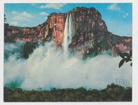 Tarjeta Postal con perspectiva del Salto Ángel en Venezuela. En el reverso de la postal aparece un mensaje manuscrito en español de Josefina para Valdés, un sello postal de España con imagen del Nacimiento del niño Jesús, el dibujo de una palma y el mapa de Venezuela.