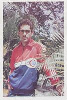 Tarjeta con imagen del ciclista cubano Eduardo Alonso. En la parte trasera de la postal aparecen logos y diseños representativos de los Juegos Panamericanos de 1991 en La Habana, Cuba.