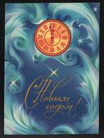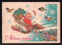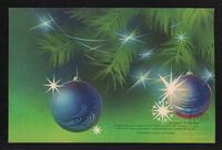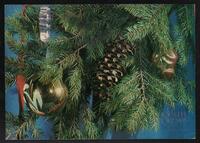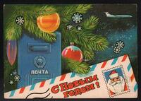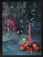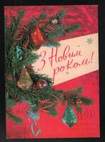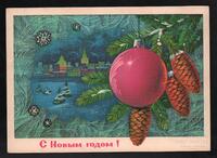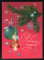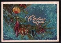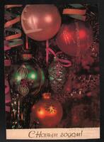 Tarjeta Postal de felicitación por el año nuevo con imagen de adornos navideños. En el anverso de la postal aparecen las palabras de felicitación en idioma ruso y letras plateadas.