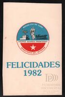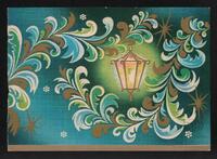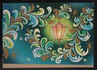 Tarjeta Postal de felicitación por el año nuevo con dibujo de un farol encendido. En la parte trasera se aprecian las palabras de felicitación en idioma español y el año de 1983 escrito a tinta.