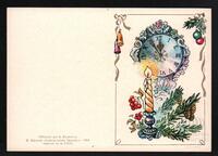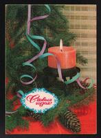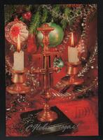 Tarjeta Postal de felicitación por el año nuevo con imagen de velas encendidas sobre un candelabro, guirnaldas y otros adornos navideños. En el anverso de la postal aparecen las palabras Feliz Año Nuevo en idioma ruso y en la parte trasera se observa un mensaje manuscrito en idioma español de Rua para Liliam Acosta y demás compañeras.