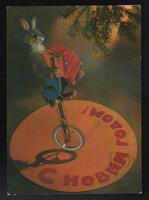 Tarjeta Postal de felicitación por el año nuevo con imagen de un conejo de peluche encima de un monociclo y con un acordeón. En el anverso de la postal aparecen las palabras de Feliz Año Nuevo en idioma ruso y en la parte trasera se muestra un mensaje manuscrito en idioma español de Baró para Paquita.