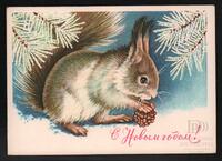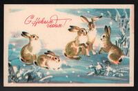 Tarjeta Postal de felicitación por el año nuevo con ilustración de un conejo en la nieve. En el anverso de la postal aparecen las palabras de Feliz Año Nuevo en idioma ruso y en el reverso se muestra un mensaje manuscrito en idiomas ruso y español de Guary para Ana y familia.