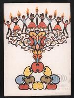 Tarjeta de felicitación por el año nuevo con dibujo de unos muchachos simulando ser un candelabro. En el reverso se muestra un mensaje mecanografiado en idioma español de Gregorio para Mine.