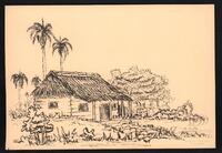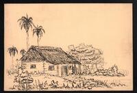 Tarjeta de felicitación por el año nuevo del Centro Nacional de Información Ciencias Médicas del Ministerio de Salud Pública con dibujo de un bohío campestre.